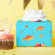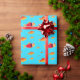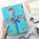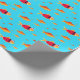 Fun Christmas wrapping paper with a pattern of goldfish in blue water (some of them sporting festive Santa outfits).