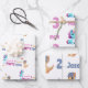 Set of three customisable unicorn and dinosaur joint kids party themed wrapping paper sheets.