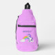 Unicorn and Rainbow Design Sling Bag with customisable background colour, and text on the front.. Other types of bags available in the drop-down menu.