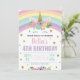 This is a unicorn and rainbows themed birthday party invite for children. The design includes rainbow and glitter decoration with stars, rainbows, and flowers.