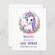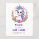 Unicorn baby shower invitation. Invite family and friends with this personalised party invitation. It features a cute unicorn. Personalise this unicorn party invitation by adding a name, date, time, location and more. This baby shower invitation is perfect for a baby shower. Matching items available.