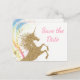 Unicorn baby shower save the date postcards with pretty gold unicorn on a rainbow swirl background. These unicorn save the date baby shower postcards are easily customised for your event by simply adding your details in the font style you prefer. You can also change the background colour. This is a printed design with no real glitter.