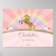 This unicorn birthday banner is pink and gold. It has a rainbow on the top with a gold unicorn on and two white unicorns. You can add your name and saying at the bottom.