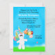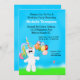 Unicorn Birthday Party Invitation for Kids. This birthday invite features a cute unicorn holding colourful birthday balloons and wearing party hat. The background is blue skies and green grass.©KristiW