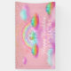 Sweet rainbow and unicorn birthday banner for rainbow party theme or unicorn birthday party theme- Reads 'Happy Birthday' with personalised name at the bottom in white, elegant lettering. Centred is a rainbow colour faux glitter unicorn standing in rainbow coloured and pastel clouds with a rainbow over his head. Sparkling effect stars in pastel colours swirl around the design. Scattered pastel clouds in the background and the bottom. Faux gold glitter foil confetti dots border the top and bottom with a girly pink background. Note: All images are printed. Not actual glitter or confetti. Pretty girls birthday party display. We have other matching unicorn party favours and rainbow invitations, as well as other kids birthday party supplies in our Zazzle.com/angela65 shop.