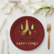 Dramatic and festive party supplies feature gold and black unicorn face with "party time! " text on red background
