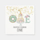 Unicorn first birthday party paper napkins in a cute whimsical style with faux gold glitter, doughnut, floral letter and unicorn cake. Pink, gold and aqua hues for a magical birthday party celebration. A soft watercolor background. The back of the invite in solid pastel aqua.