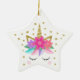 This personalised unicorn Christmas ornament features a cute whimsical unicorn face design with faux gold glitter, flowers and stars. Personalise the back with your own text.