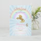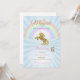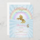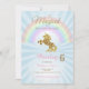Unicorn birthday invitations have a golden sparkly unicorn on them. The background is blue and it has a rainbow! These invites say "A magical day is on the way!"