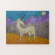 Peaceful unicorn glances over its shoulder to gaze at the moon, with a background of mountains inspired by the mountains of the Range of Light.