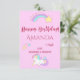 A cute unicorn and a rainbow with stars greeting card. Pastel pink background. Templates for name and year and who it's from. With the text: Happy Birthday! written in dark pink and with faux glitter.