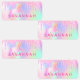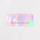 A trendy rainbow coloured, iridescent background with unicorn and rainbow pastel colours in pink, purple, rose gold, mint green. Decorated with faux glitter drips in rose gold, pink and purple and a rainbow coloured unicorn. Personalise and add a name and a phone number, written with a girly modern hand lettered style script. Purple coloured letters
