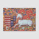Colourful ,elegant fleur de lys and heraldic motives,floral swirls red blue,flowers with a white sitting unicorn ,digital elaboration from an ancient mediaeval miniature .
