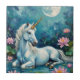 Step into a world of enchantment with this dreamy artwork featuring a majestic unicorn resting peacefully in a moonlit lily pond. Bathed in the soft glow of a full moon, the unicorn’s luminous white coat reflects the surrounding waters, creating a magical scene filled with calm and mystery. Surrounded by blooming pink lotus flowers and floating lily pads, this mythical creature’s horn evokes a sense of wonder and serene power. The deep blues and purples of the night sky form a captivating contrast with the ethereal light of the moon, drawing the viewer into a tranquil and otherworldly realm.