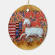 Colourful Christmas ornament with elegant fleur de lys and heraldic motives,floral swirls red blue,flowers with a white sitting unicorn ,digital elaboration from an ancient mediaeval miniature .