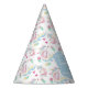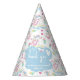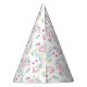 The design features a stylised unicorn head with a flowing pastel-coloured mane in shades of pink, blue, and yellow, adorned with sparkles. Surrounding the unicorn are decorative elements, including pink hearts, blooming flowers, and green leaves, creating a dreamy and whimsical aesthetic.
