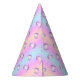This seamless pattern features a whimsical unicorn with butterfly-like wings, a flowing multicolored mane, and a playful pose as if prancing or leaping through the air. The unicorn has soft pastel shades of pink, blue, and purple with small star details on its body. The background consists of a dreamy gradient of pink, blue, and peach, filled with scattered glowing stars. The overall aesthetic is magical, dreamy, and fairy-tale-like.