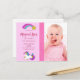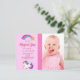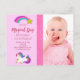 On front: A 1st birthday party invitation with faux pink glitter. A cute unicorn and a rainbow with star. Pastel pink background. Insert Your photo of the birthday girl! Templates for name, age 1 one, and party details.