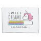 This pastel coloured unicorn pillow case features a cute pink haired sleepy unicorn with the text " Sweet Dreams Loading " and a pastel rainbow loading screen.