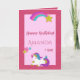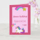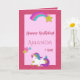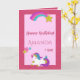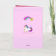 A birthday greeting card with faux glitter. A cute unicorn and a rainbow with stars. Pastel pink background and a faux glitter frame. Templates for name and year.
