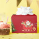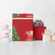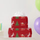 Elegant, minimalist Christmas wrapping paper with a unicorn pulling Santa's sleigh towards a fir tree decorated with silver baubles. The unicorn has a red and golden mane and tail and the sleigh carries Santa along with many gifts. On a Christmas red background.