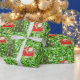 Christmas wrapping paper with a unicorn pulling Santa's sleigh towards a Xmas tree decorated with silver baubles. The unicorn has a red and golden mane and tail and the sleigh carries Santa along with many gifts. The background is simulated green glitter made of small green and white mosaic-like pieces.