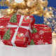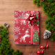 Elegant, modern, festive Christmas wrapping paper with a unicorn pulling Santa's sleigh towards a fir tree decorated with silver baubles. The unicorn has a red and golden mane and tail and the sleigh carries Santa along with many gifts. On a Christmas red background, with many cute snowflakes.