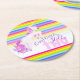 Second birthday party coasters, featuring a whimsical mythical unicorn watercolor painting and colourful rainbow stripes. Personalise with your own choose of name. Currently reads Happy Birthday Abigail two. Unique drawing, watercolor painting art and graphic design by Sarah Trett www.sarahtrett.com for www.mylittleeden.com
