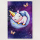 A beautiful illustration of the cutest pink unicorn pony curled up in a blue pouf fast asleep. It is surrounded by a purple star filled magical shimmer background that has two pink and yellow butterflies flitting around. This puzzle is ideal for both kids and adults alike. They are great as stocking stuffers too!