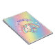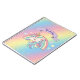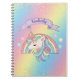 This cute and colourful custom notebook features a beautiful illustration of a unicorn and pastel coloured rainbow over a rainbow gradient background. Faux gold glitter accents the top and bottom portions. Little stars in matching colours surround the rainbow. A banner is printed above the unicorn with a sample name printed below in an elegant purple script font. You can personalise the notebook to include your own custom name or text.
