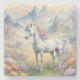 A stone coaster showing a dreamy image of a white unicorn with a rainbow mane standing in a field of flowers. In the background are majestic mountains. The perfect gift to give those who love magical and mystical unicorns. Contains generative content.