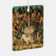 This unicorn tapestry is an enhanced reproduction of the "The Unicorn is Found" tapestry, which is the second tapestry of a series of seven mediaeval tapestries that showcases the mythical unicorn.The series is entitled "The Hunt of the Unicorn" which are also referred to as the Unicorn Tapestries". The tapestries were created from 1495-1505. This Unicorn is Found tapestry shows a group of mediaeval noblemen and hunters, as well as all kinds of ferocious lions and leopards. There is a unicorn at the front, a beautiful white unicorn, which has its horn pointed downward as it kneels. There is a mediaeval fountain between the unicorn and the huntsmen.