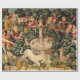 This unicorn tapestry is an enhanced reproduction of the "The Unicorn is Found" tapestry, which is the second tapestry of a series of seven mediaeval tapestries that showcases the mythical unicorn.The series is entitled "The Hunt of the Unicorn" which are also referred to as the Unicorn Tapestries". The tapestries were created from 1495-1505. This Unicorn is Found tapestry shows a group of mediaeval noblemen and hunters, as well as all kinds of ferocious lions and leopards. There is a unicorn at the front, a beautiful white unicorn, which has its horn pointed downward as it kneels. There is a mediaeval fountain between the unicorn and the huntsmen.