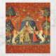 The Lady and The unicorn, a mediaeval tapestry from around 1500, is one of a set of French tapestries, considered great works of art from the Middle Ages. This Lady and the Unicorn tapestry is a stunning image of a lady standing in a tent, with a unicorn on one side of her, and a lion on the other. There's a little white dog sitting on a bench next to her, and a handmaiden on the other side. The tapestry's background is a red field of flowers and animals, including dogs, rabbits, and birds. The original mediaeval Unicorn tapestry was quite damaged and lost much of its original bright colouring and quality. While we were able to restore some of the Unicorn tapestry's original red and blue mediaeval colouring, please be aware that there are still imperfections in the image. Also, please be aware that this Mediaeval Tapestry product looks like a tapestry, but it is just based on the image. However, ours is a unique version of this mediaeval tapestry, as we have extended it and enhanced it to bring out its original beauty. See more antique images on our gifts by clicking on "store" above.