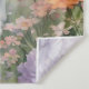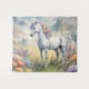A tapestry showing a dreamy image of a white unicorn with a rainbow mane standing in a field of flowers. In the background are majestic mountains. The perfect gift to give those who love magical and mystical unicorns. Contains generative content.