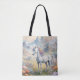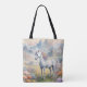 A tote bag with a dreamy image of a white unicorn with a rainbow mane standing in a field of flowers. In the background are majestic mountains. The perfect gift to give those who love magical and mystical unicorns. Contains generative content.