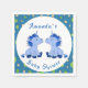 Unicorn twin boy baby shower paper napkins with two cute little baby unicorns. The unicorns are blue with dark blue mane nad tail. The border is blue with beige and green dots and circles. You can easily personalise these unicorn baby shower paper napkins with your name and your costum text. The text can be in the font style and colour of your choice. You can choose your own background colour of the border by costumizing the napkins.