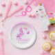 Whimsy unicorn art pink baby shower party plates. Original watercolor art painting and graphic design by Sarah Trett. www.sarahtrett.com for www.mylittleeden.com