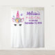 A photo backdrop tapestry personalised with your event details. Designed with a trendy pink unicorn. Wearing a fancy floral crown. Cute littlel butterflies fluttering around. Fake gold confetti sprinkled along the top.