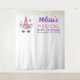 A photo backdrop tapestry personalised with your event details. Designed with a trendy pink unicorn. Adorned with a fancy floral headpiece. Whimsical butterflies flying around. Fake gold confetti sprinkled along the top.