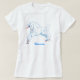 white regal unicorn gallops with flying mane and tail. Rainbow horn. says unicorns! on blue in front and I dare to believe on the back.