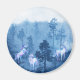 Mystical, fantasy design of unicorns in a misty pine forest.