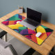 Introducing the "Unique Geometric Shapes Abstract Desk Mat" – an artistic fusion of modern geometry and vibrant creativity. This desk mat features an array of intricate, interlocking shapes that dance across a canvas of bold, contrasting colours. Each shape is meticulously designed to create a visually stimulating pattern that not only adds a touch of sophistication to your workspace but also sparks inspiration