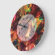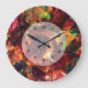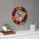 Beautiful modern abstract wall decor clock in a designer inspired creation in shades of pink, red. green, and blue. Designed as a kitchen clock, bathroom clock, or bedroom clock as a decorative accessory in your home.