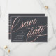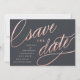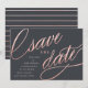 These unique, modern save the dates feature fancy script in a faux rose gold foil effect on a grey background, with the wedding announcement details in white. The backer features a trendy rose gold stripe pattern.