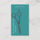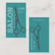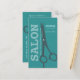 Modern cutting edge artistic illustration business card with hair salon stylist cutting scissors. Customised Blue green, soft blue and grey colours with edgy vertical layout gives a trendy stylish visual identity to this bold layout template business card design. A bold salon appointment option for your women's beauty spa business.
