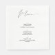 Use these napkins for a pretty table setting at your wedding, featuring your wedding menu or birthday menu. Customise it with your own text. This wedding menu design features modern script and a clean sans-serif font for the menu on this minimal design.