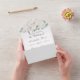These invitations prominently display a white rose, which symbolises purity, innocence, and new beginnings, complemented by the vibrant, earthy tones of green.