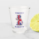Show everyone your love for the United Kingdom with this shot glass featuring a map of the United Kingdom filled in with the colours of the flag. The colour and font of the text can be changed to fit your preference.