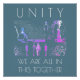 An inspirational message that speaks to the ideal "Unity" of humankind, as well as the practical reality that "We Are All In This Together." Why not strive for the ideal? The inspirational message appears in white lettering with a magenta pink and medium blue graphic in simple lines on a muted teal blue background that illustrates the similarity and potential bondedness of human beings.